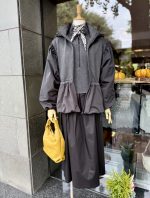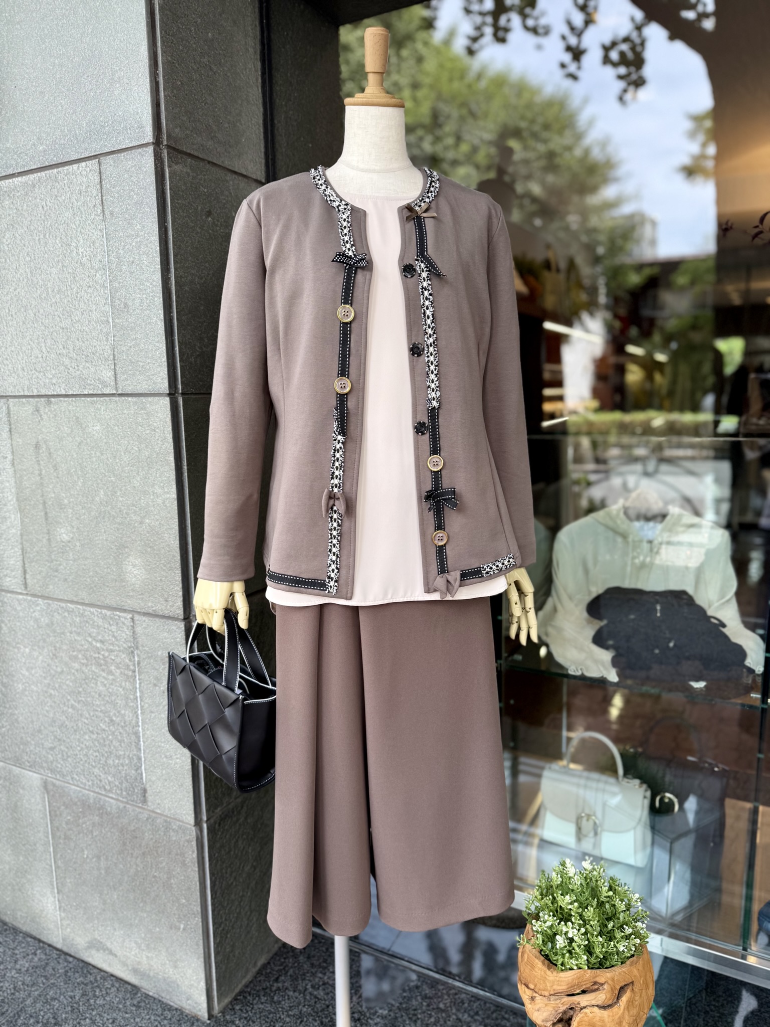 やっと朝夕には秋の気配が感じられるようになりました。今週は、しなやかな着心地なのに華やかさもあるジャケット&ラップ風ガウチョパンツのご紹介です。