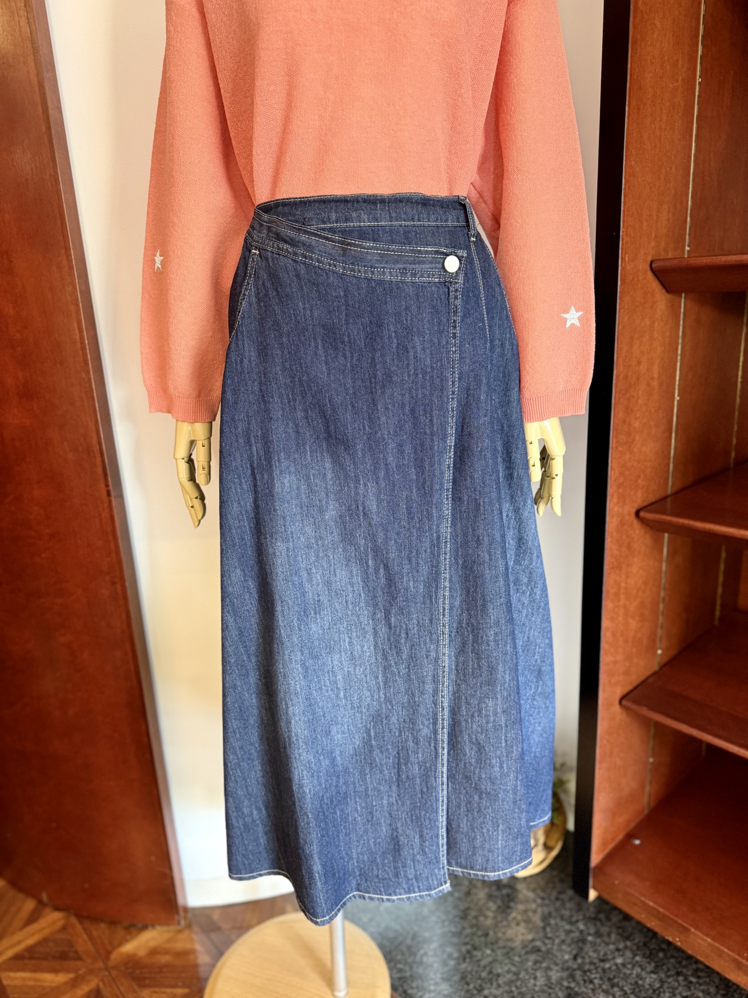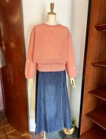 抜け感デニムスカートと、上品な光沢を含んだサラッとニットとのコーディネートをご着用していただきました