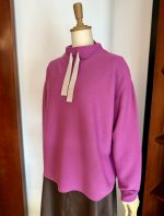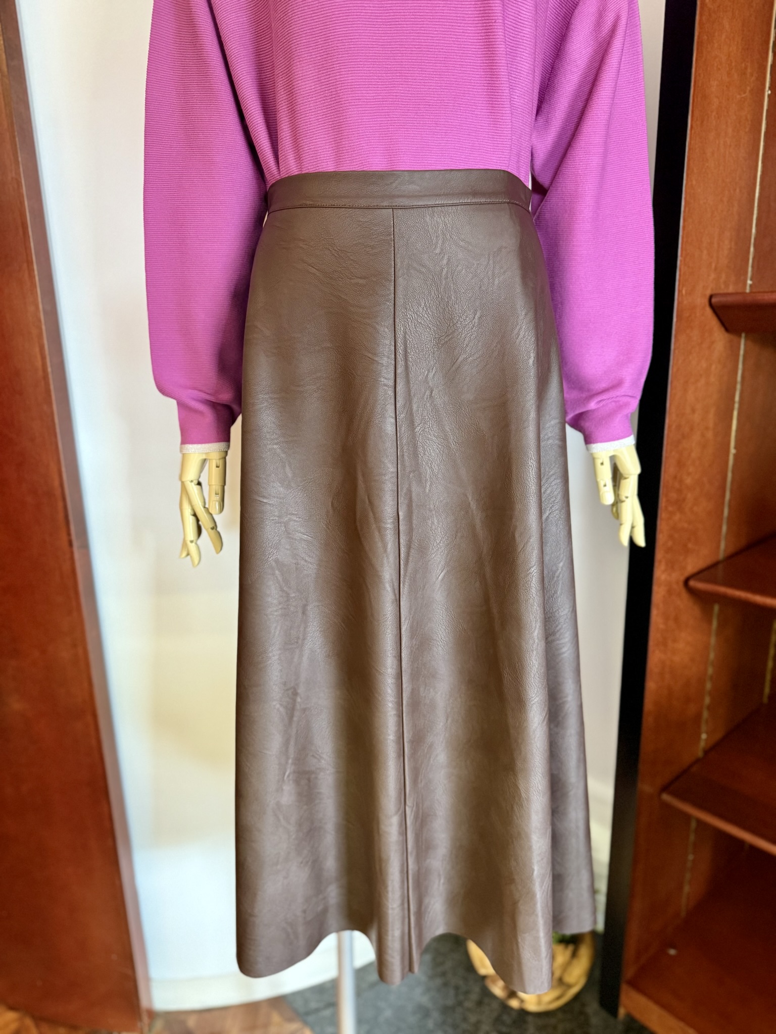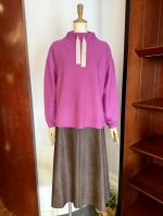 本日、進藤様には、変形パーカー風カットソーと、エコレザーのフレアスカートをご着用していただきました。 こっくりとしたピンクと、マロンブラウンのカラーが秋を素敵に演出、秋の深まりを意識した大人のカジュアルスタイルです。