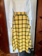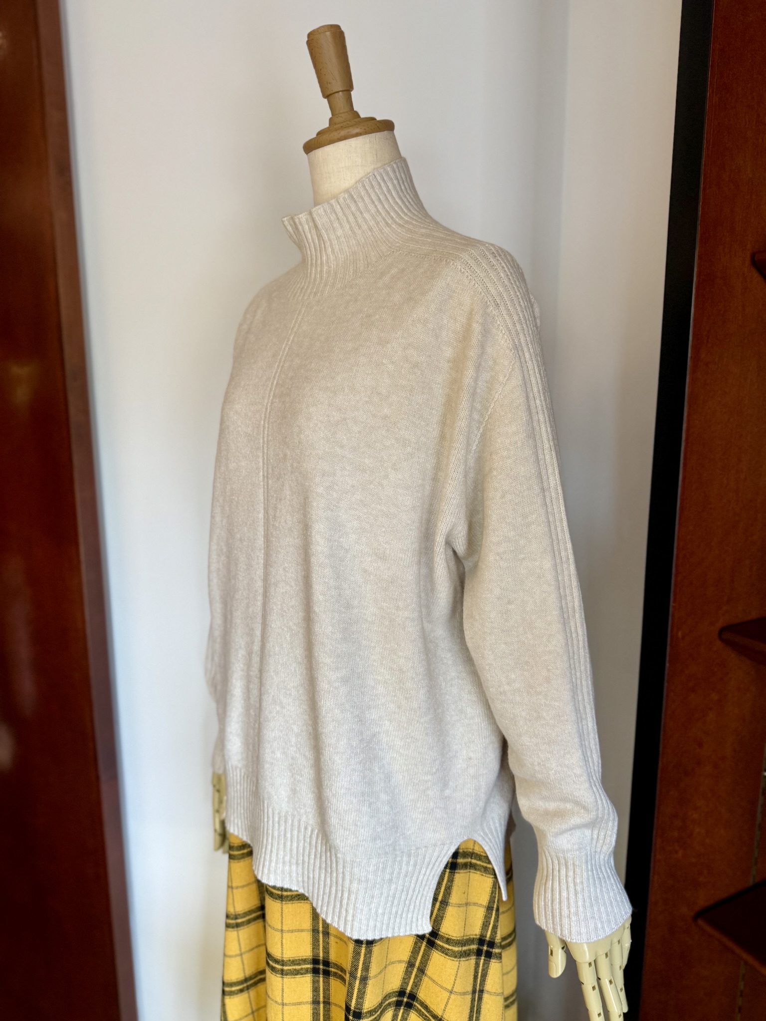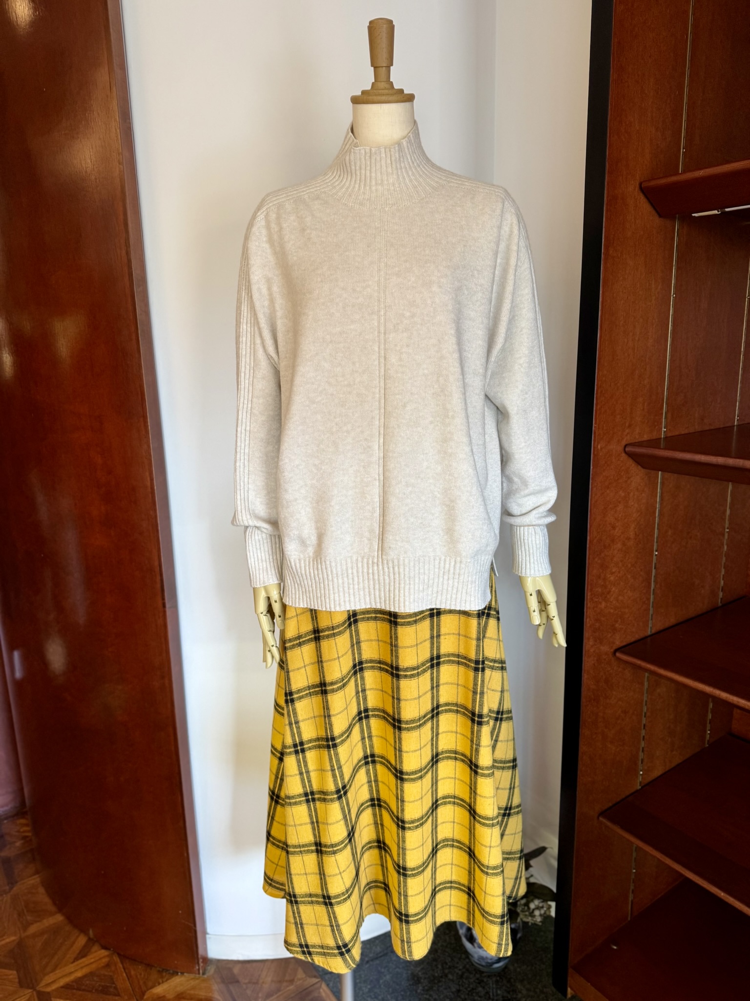 本日、進藤様には、軽くて暖かいハイネックニットと、明るいイエローのチェックスカートとのコーディネートをご着用していただきました。