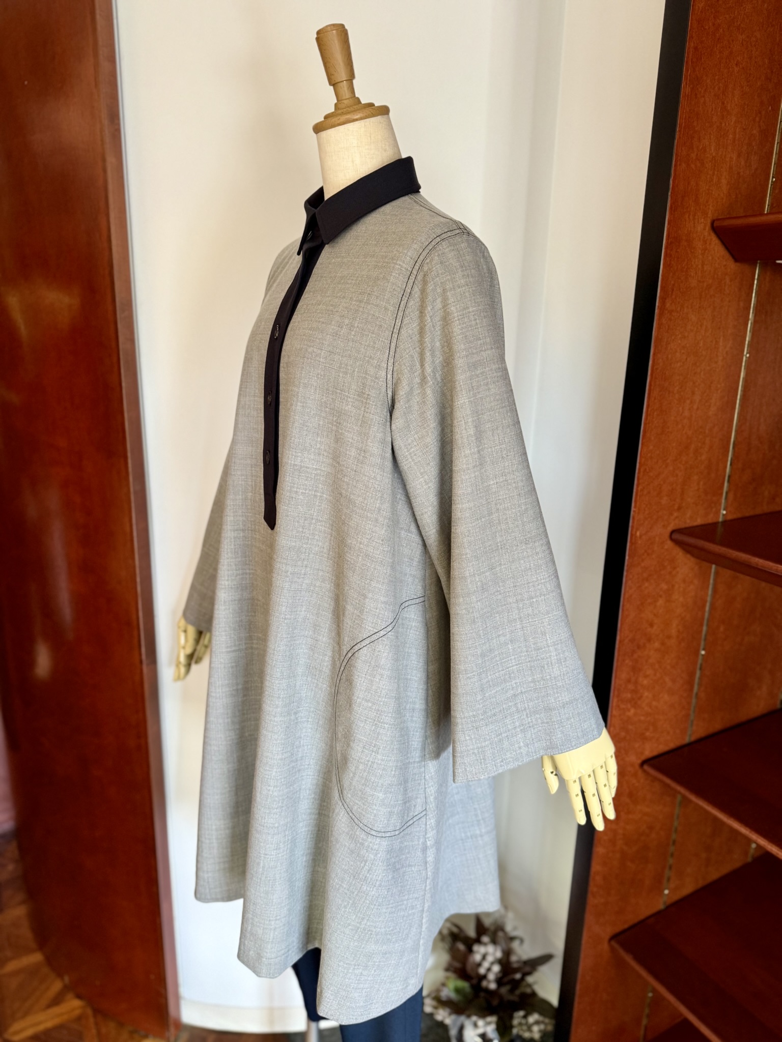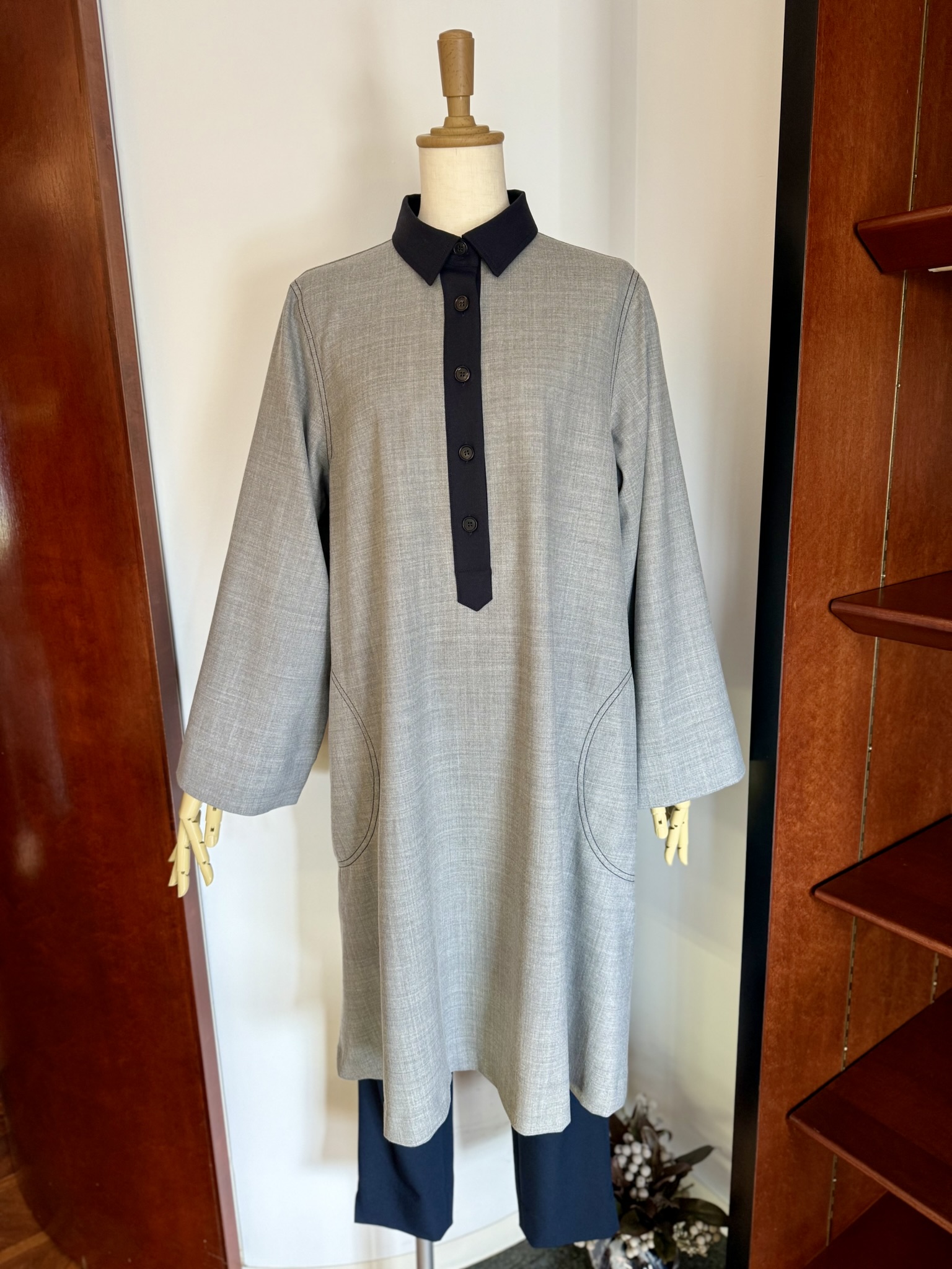 本日、進藤様には、キリリとしたシャツの印象をそのままに、女性らしいワンピースに仕立てた配色シャツワンピースをご着用していただきました