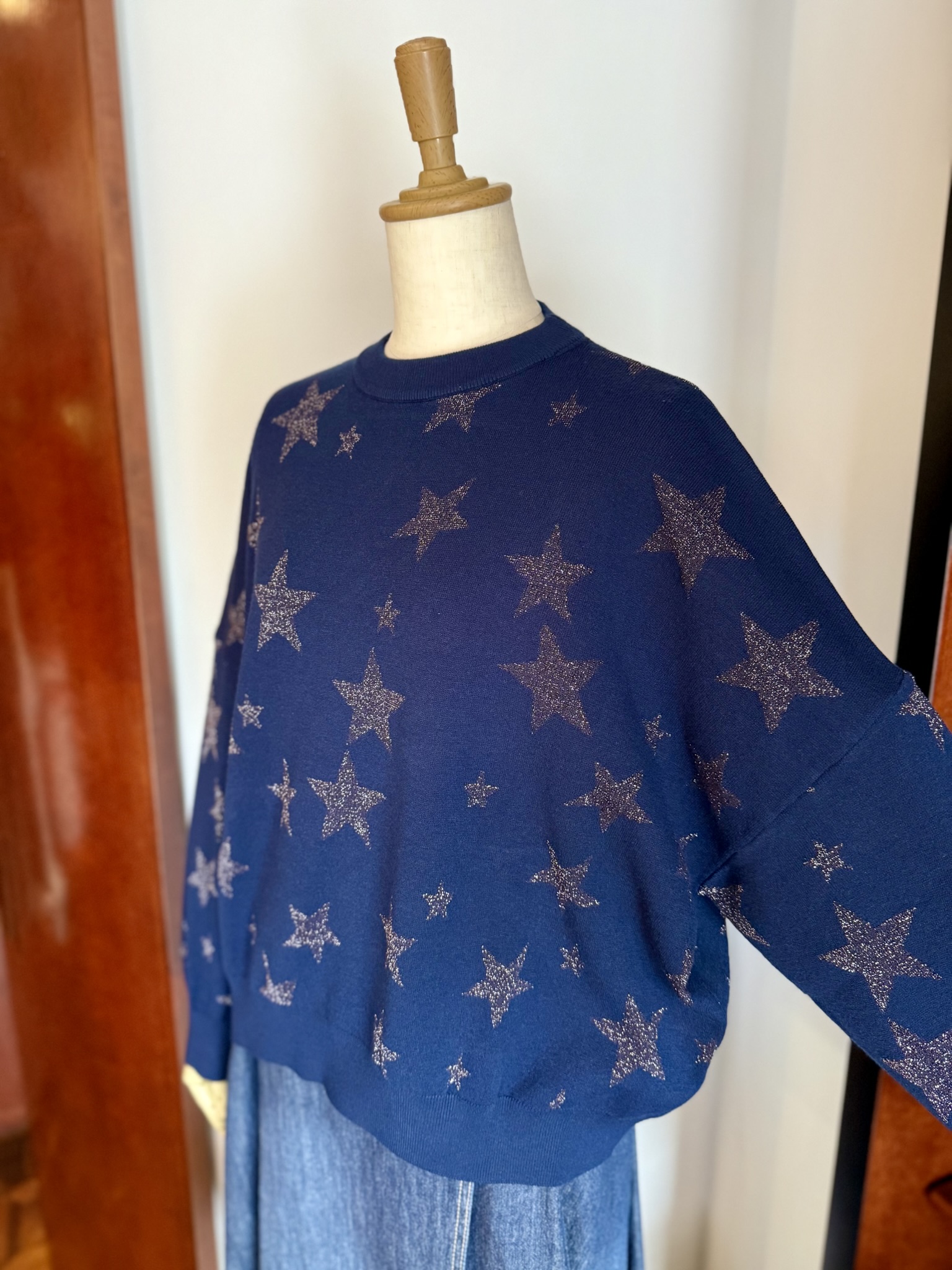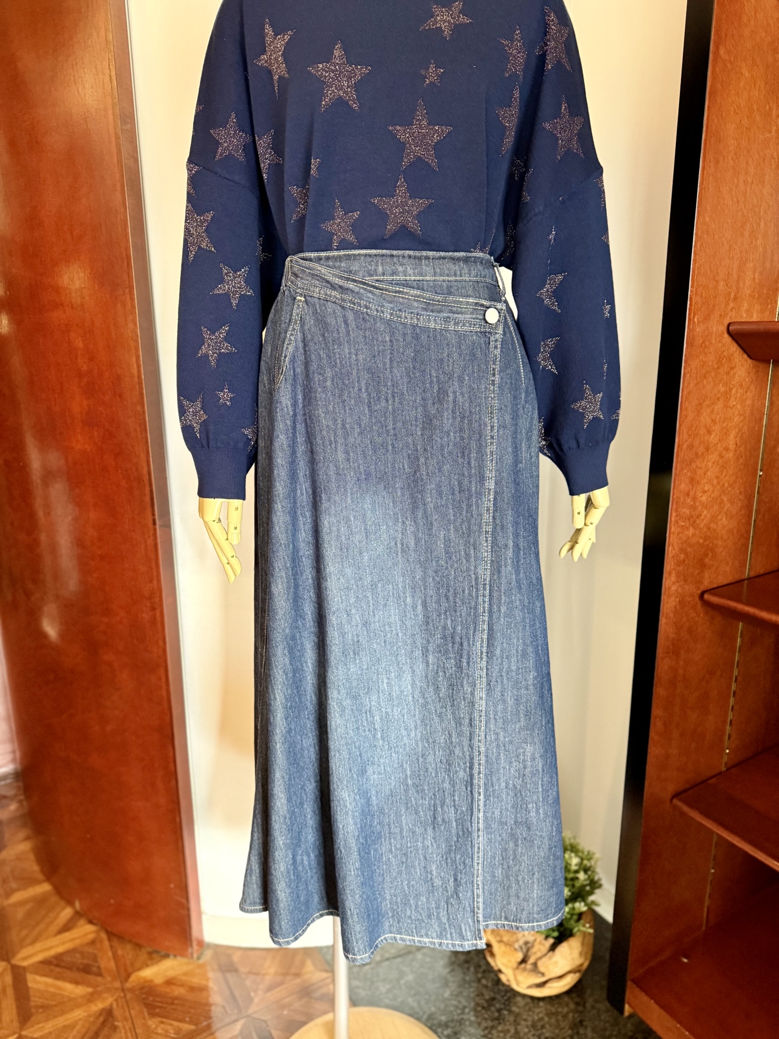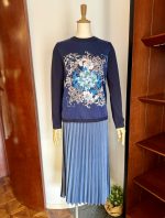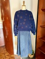 本日、進藤様には、気分の上がるキラキラスター柄のニットトレーナーをご着用していただきました。 一枚でパッと心ときめく、華やぐデザイントップとデニムスカートのコーディネートです。 ■ラメ糸星柄ニットトレーナー アッカドゥエ ¥39,600 ■デニムラップフレアスカート Sugar&Spice ¥19,800